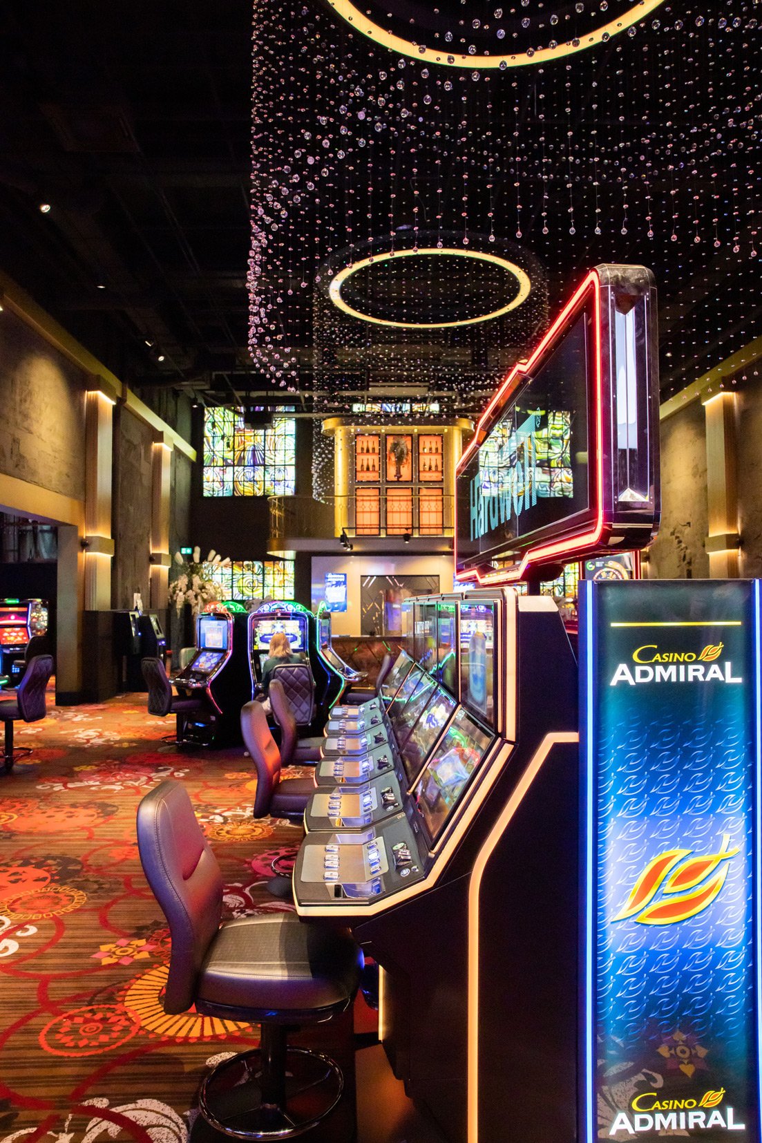 The interior design of Casino ADMIRAL Helmond was inspired by the rugged look of old masonry, the industrial elements of ironwork as well as the lush art deco style of the roaring 20s, the era in which the famous “Scala” cinema was originally built. The result is a sophisticated mix of textures, materials and colours, which range from the original materials of the building’s core, to premium crafted plate work, chandeliers and a striking alcohol-free gin-bar that dominates the front wall of the main gaming area. Lighting is provided by means of multi-coloured LEDs and realistic stained glass-like ornaments. Interactive light installations and video screens have been integrated to accentuate special occasions like jackpot hits and can be adapted to the time of day.