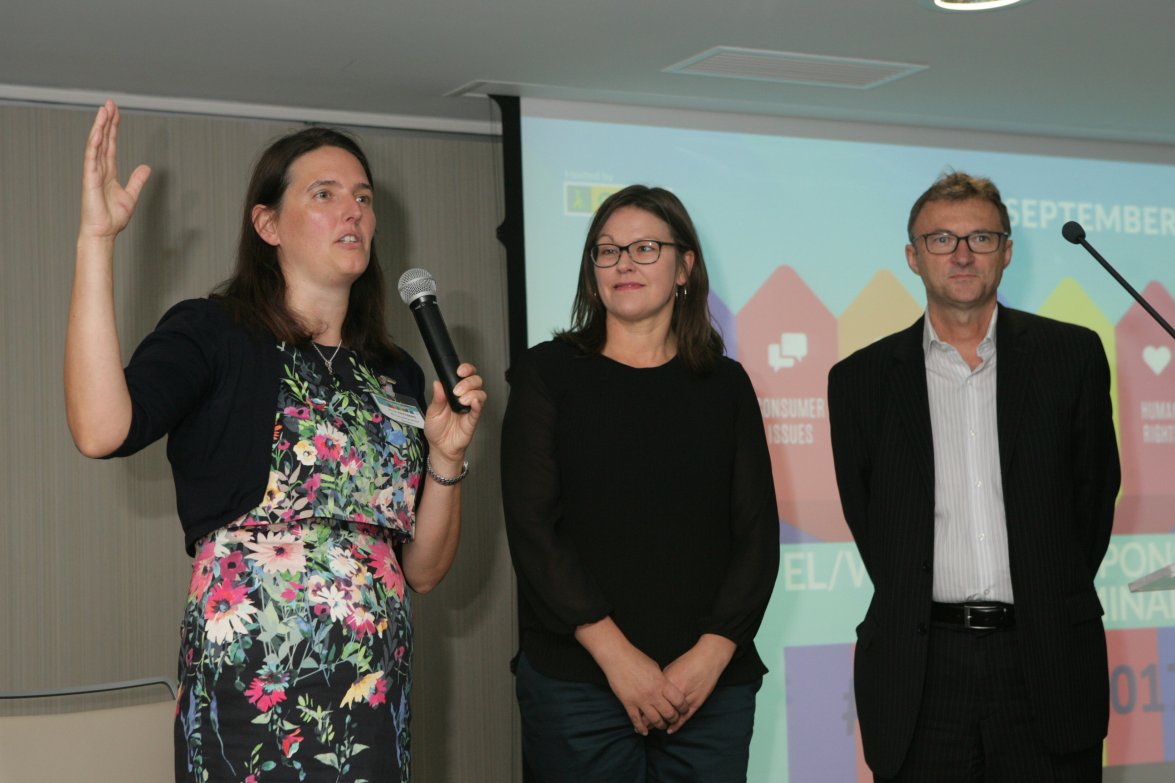 Ms Anne Pattberg, Chair of the Independent Assessment Panel of WLA, announcing the Responsible Gaming certification of NOVOMATIC Lottery Solutions at the WLA CSR and RG seminar in Madrid 20-22 September. Present on behalf of NLS: Fanney Karlsdottir, Corporate Responsibility and Sustainability Manager, and Marc Chabrand, Director of Field Marketing and Lottery Operations.