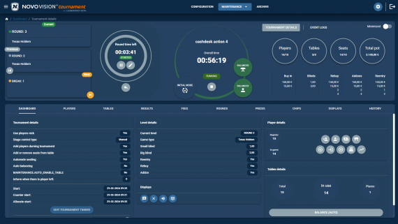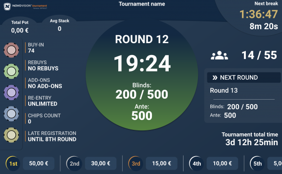 The NOVOVISION™ tournament module enables you to plan, organize and manage your own Poker tournaments and even leagues, with full administrative control of the events at the tables. NOVOVISION™ tournament supports any type of Poker game.