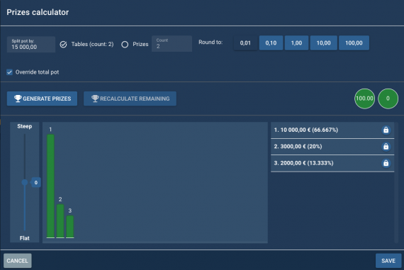 The dynamic prize calculator facilitates the fast & easy creation of an attractive rewards structure for players, based on the number of tables or players.